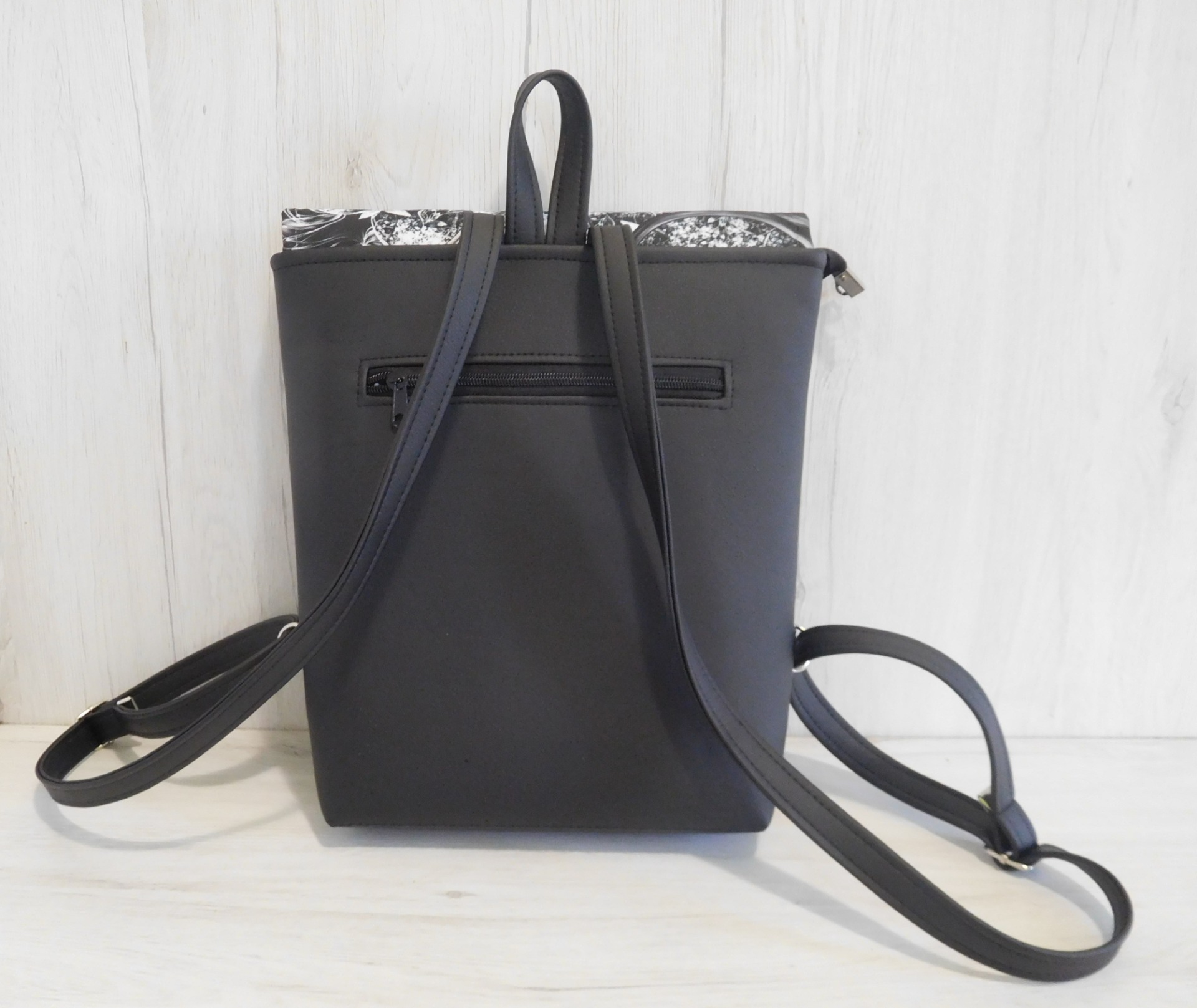 Zadní díl, dno a kousek předního dílu je vždy ze soft koženky, přední díl z koženky, bavlny nebo kočárkoviny. Uvnitř je bavlněná černá podšívka s bílým puntíkem a kapsičkou na zip.